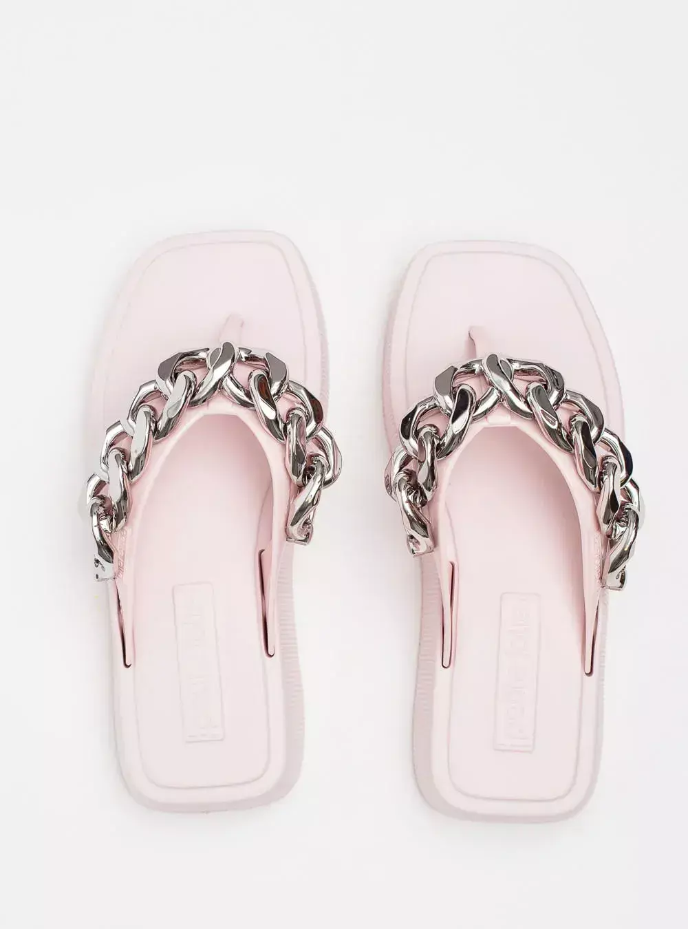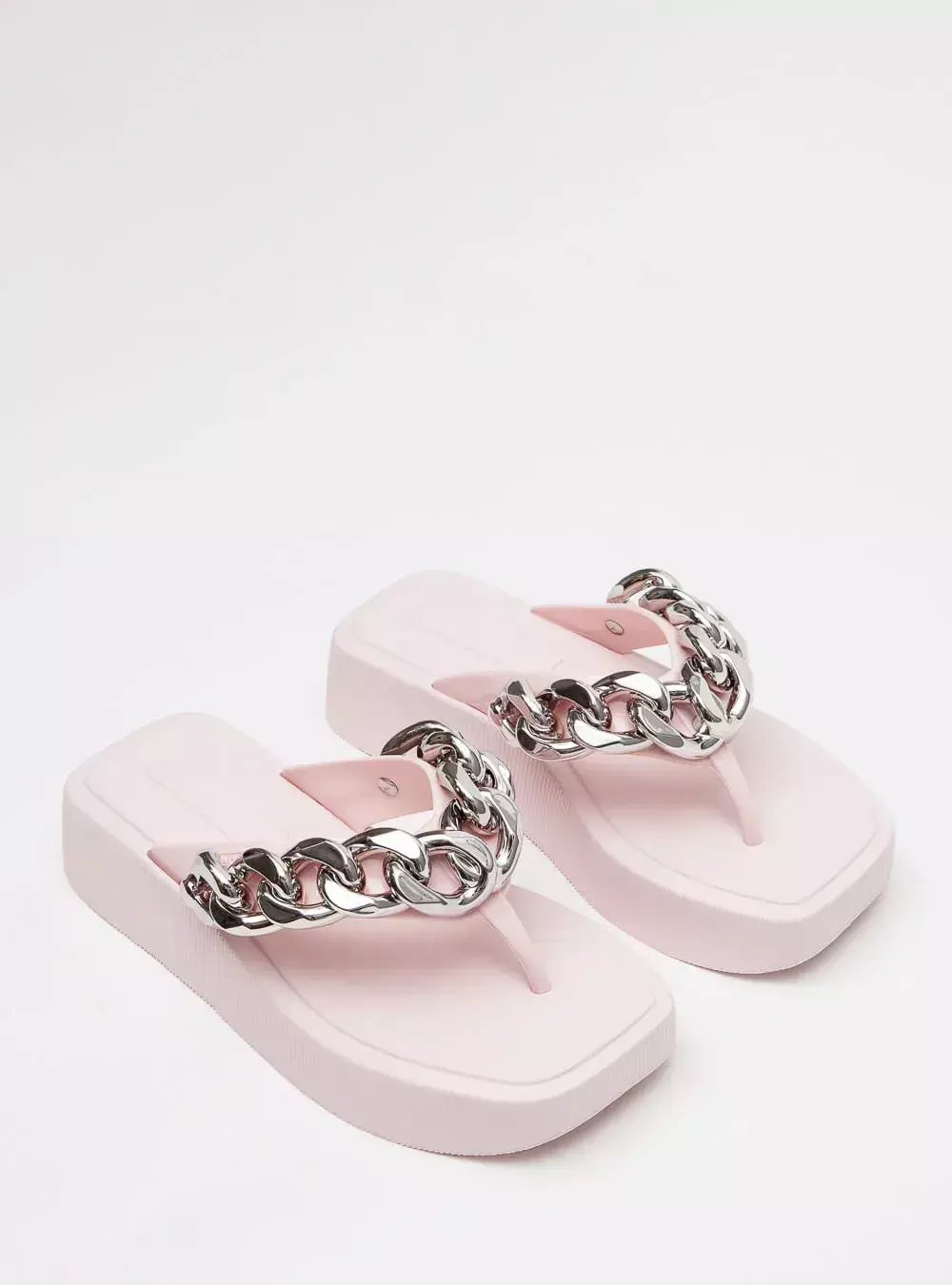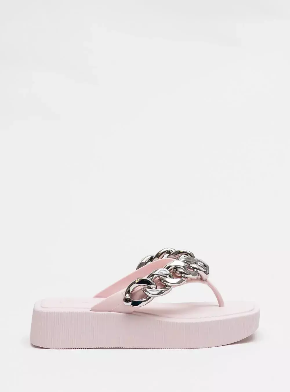 Este chinelo de dedo possui um solado flatform em EVA, super leve, que garante estabilidade e estilo com o seu bico quadrado diferenciado. As tiras grossas em J-Lastic separam os dedos com delicadeza, enquanto a aplicação de correntes metalizadas confere um brilho sutil e sofisticado, ideal para quem quer destacar-se com elegância.